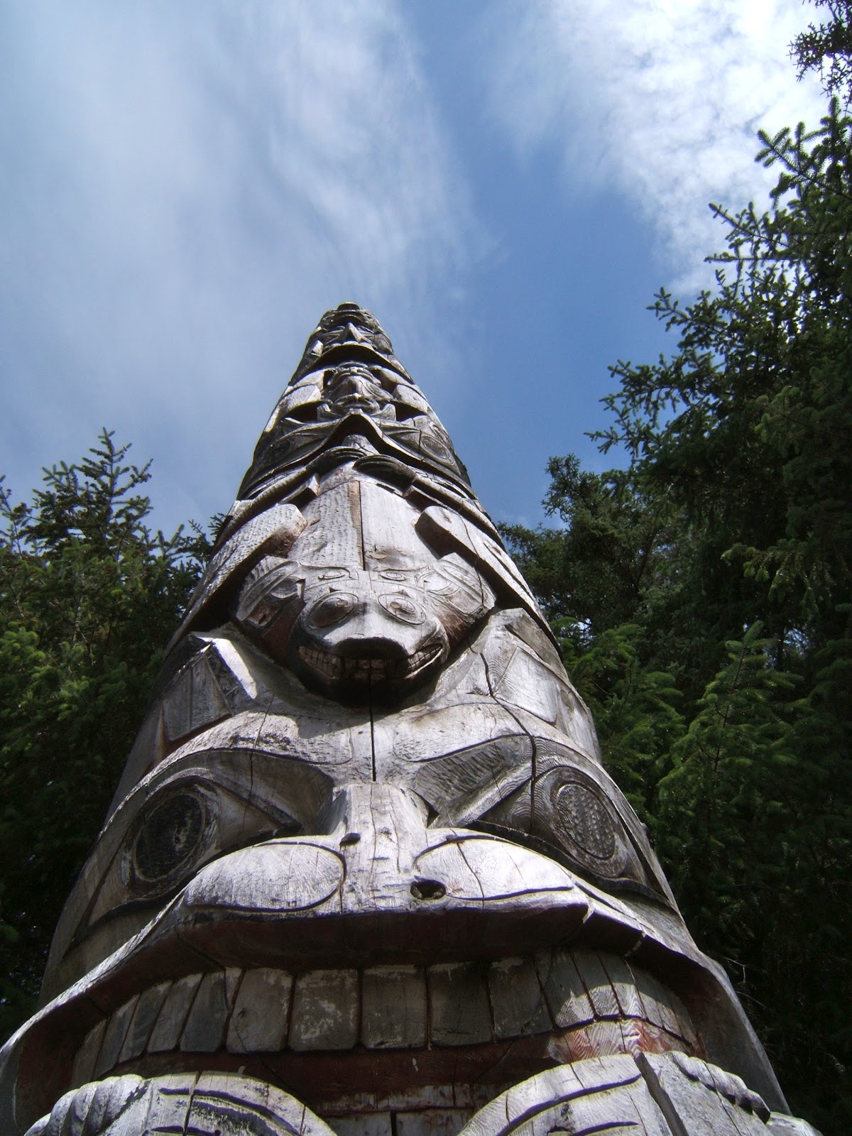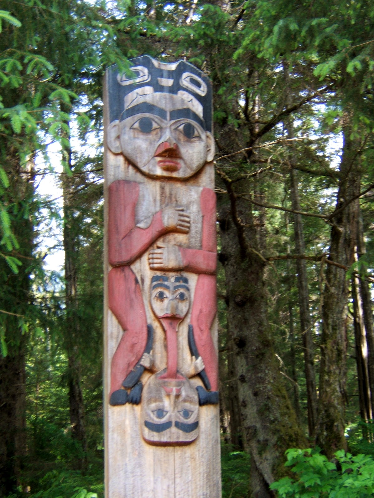 Sitka’s National Historic Park was also that great combo of interesting and educational. It features exhibits on the history and culture of Alaska’s native peoples: Eskimo, Aleut, Haida, Athabaskan and Tlingit. There is a lot to see inside and out here. A gorgeous walk through the trails here turn up interesting things around every corner. Mostly in the form of totem poles. Here are several that we found on our walk.