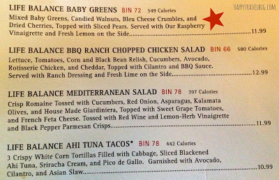 But the wine isn’t the only great part of Cooper’s Hawk. They have excellent food as well. The extensive menu has a regular section where they don’t list the calories and then a “life balance” section where they do. The BIN # refers to the wine section of the menu and what wine would pair well with that food item. I put big red stars next to the food I ordered.