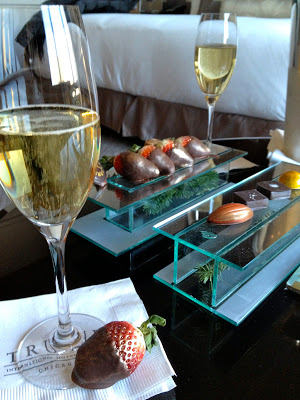 Surprise number two and three were waiting for me in the room. There was champagne, gourmet chocolates and chocolate covered strawberries painted with edible gold waiting for us to enjoy while we took in the most amazing view.